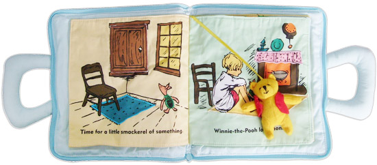 Winnie-the-Pooh will find new fans among the youngest children with this deluxe interactive soft storybook. A handsome, beautifully crafted fabric book, Baby's First Winnie-the-Pooh features an eight-page story encased in a colorful padded cloth cover with a neat zipper closure and a fabric handle. The full-color artwork, faithful to Ernest H. Shepard's beloved originals, is accented with vibrant embroidery throughout. A soft miniature Pooh doll is attached with a ribbon to the spine of the storybook, so little ones can move Pooh from scene to scene and from one adventure to the next throughout the book. Small hands will find things to manipulate on every spread--there are curtains to lift, honey cupboards to open,